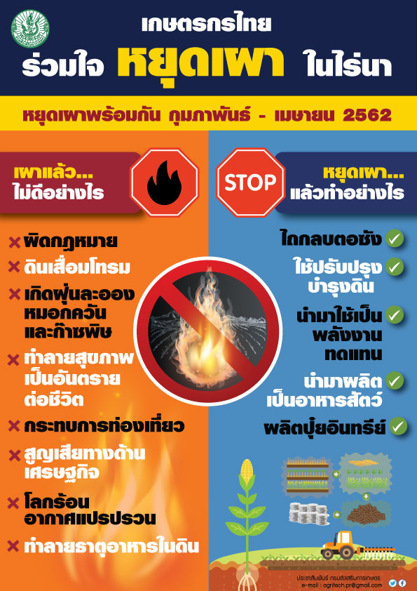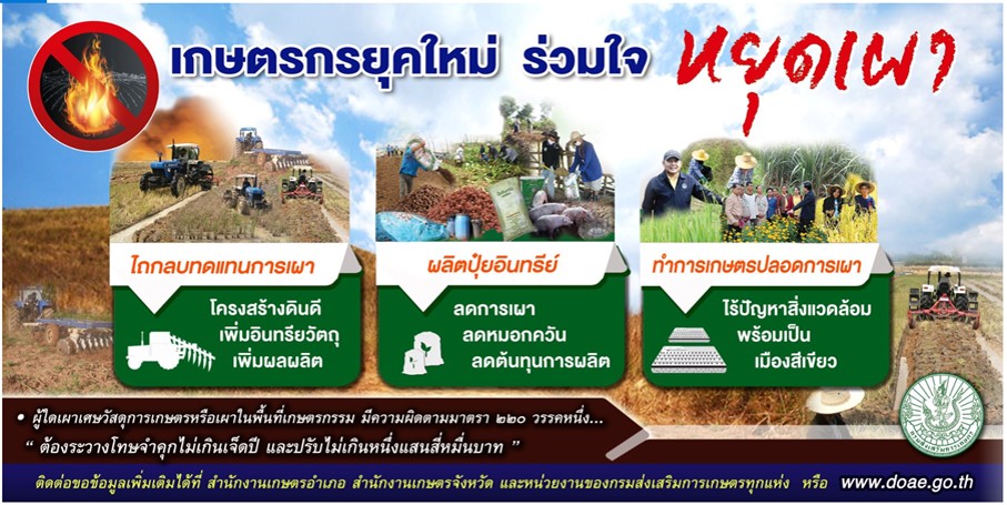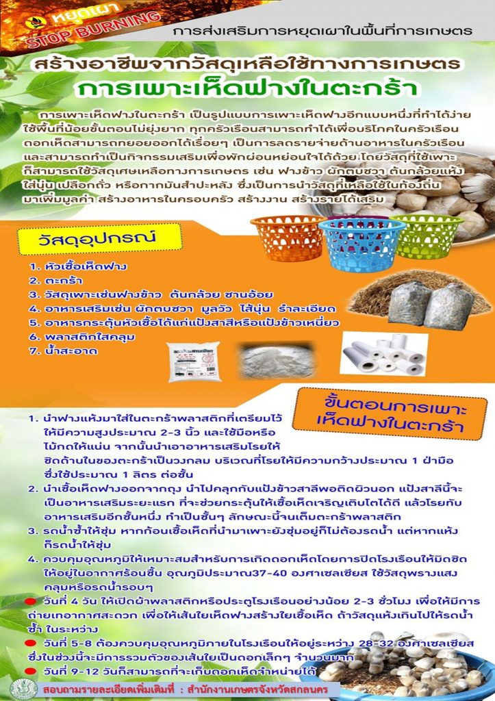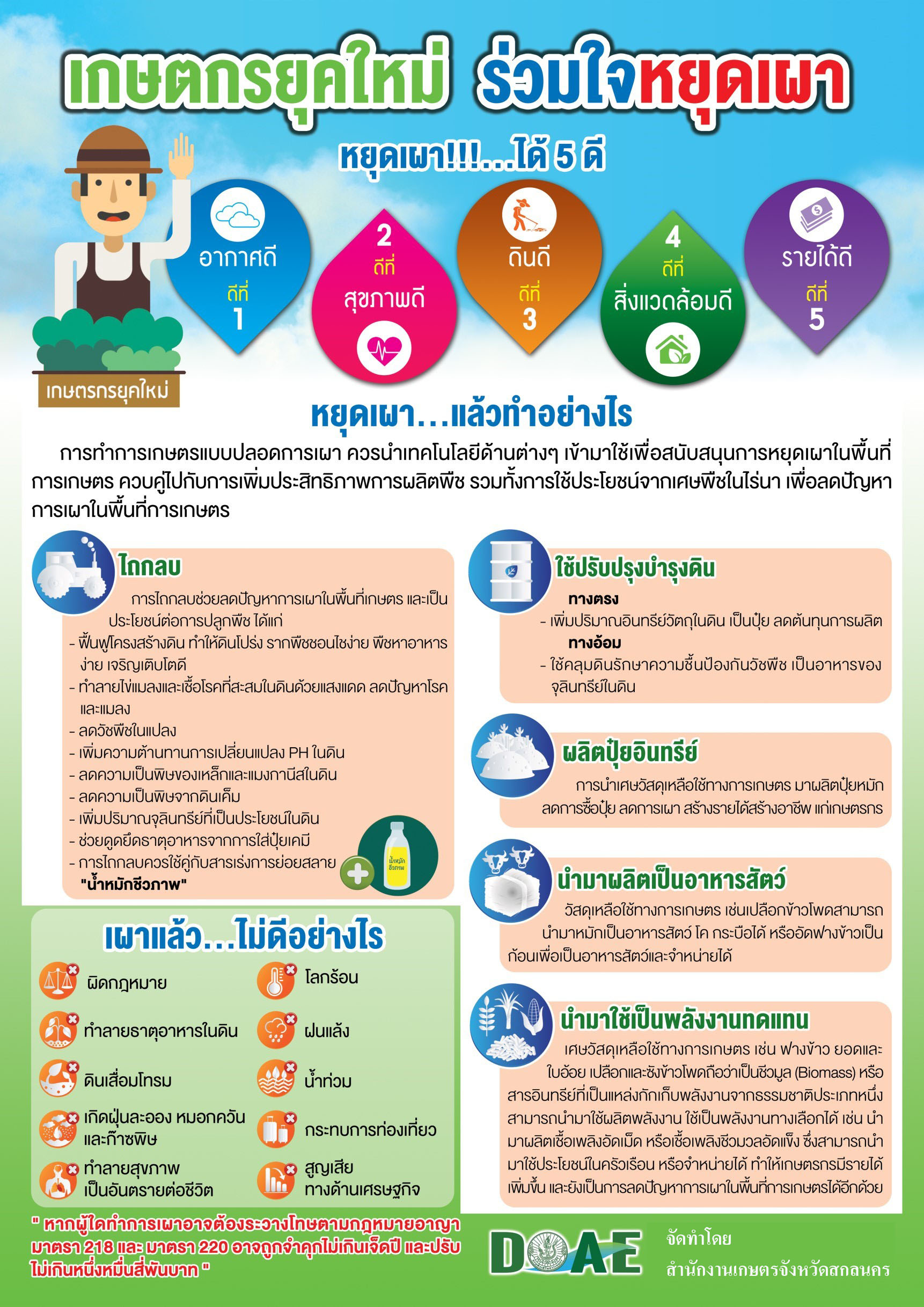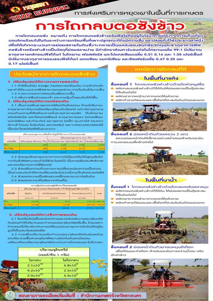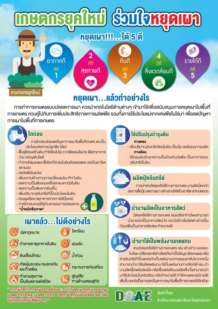นายประยงค์ ภูดินทราย เกษตรจังหวัดสกลนคร รณรงค์งดเผาในพื้นที่การเกษตรและที่โล่งแจ้ง ปรับเปลี่ยนทัศนคติและจิตสำนึกของเกษตรกรให้ยอมรับการทำการเกษตรแบบปลอดการเผา โดยแนะนำให้เกษตรกรดำเนินการต่างๆ ดังนี้ 1 การไถกลบตอซัง 2 ทำปุ๋ยอินทรีย์ ปุ๋ยหมัก 3 นำเศษวัสดุการเกษตรมาใช้เลี้ยงสัตว์ 4 นำมาใช้ประโยชน์เป็นพลังงานทดแทน 5 นำมาเพาะเห็ด นำมาผลิตกระดาษ หรือของประดับ 6 คลุมบริเวณโคนต้นพืช เก็บรักษาความชื้น 7 ทำวัสดุเพาะปลูกทดแทนการเผา