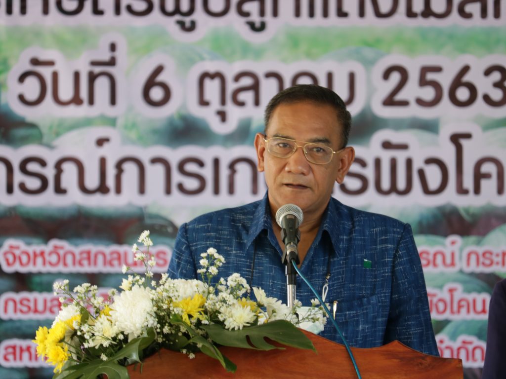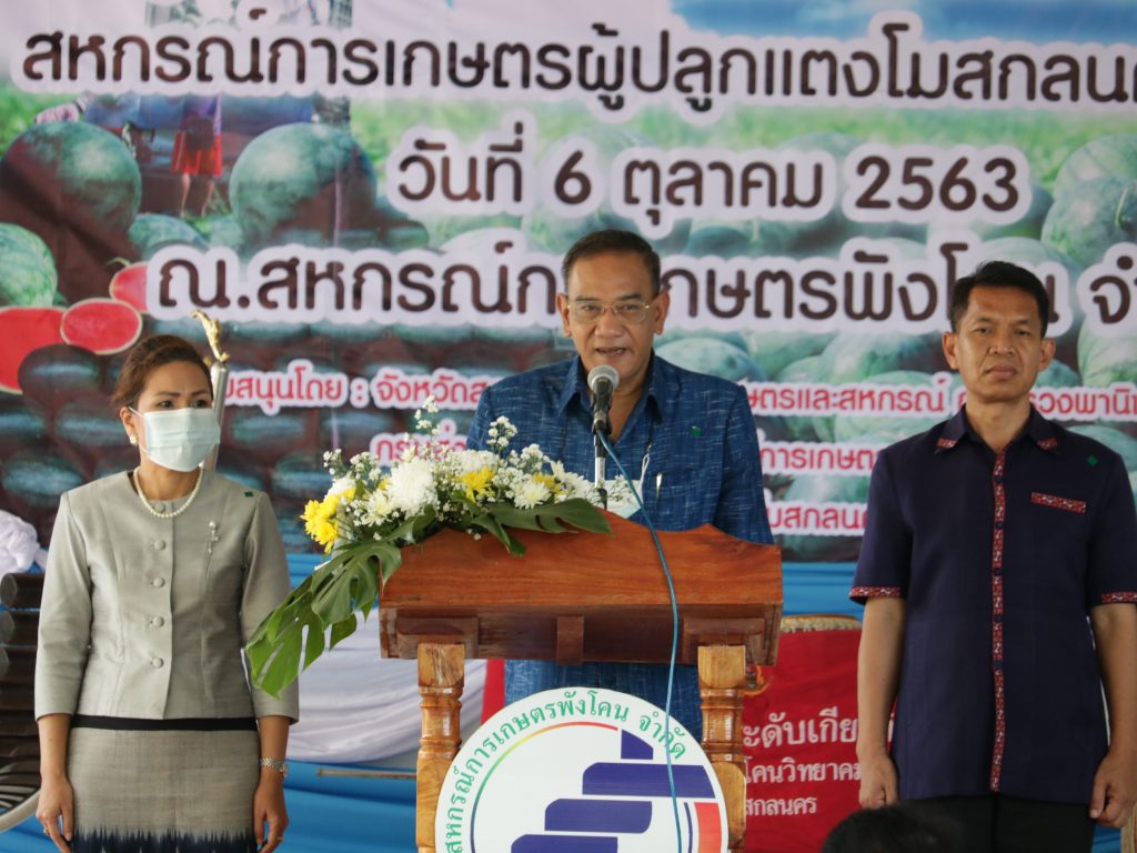 นายประยงค์ ภูดินทราย เกษตรจังหวัดสกลนคร ร่วมพิธีเปิดศูนย์กลางรวบรวมและกระจายแตงโม ณ ศูนย์กลางรวบรวมและกระจายแตงโม ตำบลพังโคน อำเภอพังโคน จังหวัดสกลนคร โดยมีนายปรีชา ทองคำ รองผู้ว่าราชการจังหวัดสกลนคร เป็นประธานเปิดงาน และมีส่วนราชการต่างๆที่เกี่ยวข้อง เกษตรกรกลุ่มผู้ปลูกแตงโม และพ่อค้า แม่ค้าเข้าร่วมกิจกรรมในครั้งนี้ ในการดำเนินงานครั้งนี้เป็นความร่วมมือระหว่าง สหกรณ์การเกษตรผู้ผลิตแตงโมสกลนคร จำกัด ร่วมกับ สหกรณ์การเกษตรพังโคน จำกัด เพื่อให้สมาชิกสหกรณ์มีความมั่นคง ยั่งยืน เป็นรูปธรรม เป็นการส่งเสริม พัฒนาสหกรณ์ ให้เป็นศูนย์กลางรวมการ และจำหน่ายผลผลิตทางการเกษตร (แตงโม) ซึ่งสมาชิกกลุ่มสหกรณ์การเกษตรผู้ผลิตแตงโมสกลนครได้ปลูกแตงโมอย่างต่อเนื่อง เป็นประโยชน์กับสมาชิกสหกรณ์ เพิ่มช่องทางการตลาดแตงโม ลดการเคลื่อนย้ายแรงงานภาคการเกษตรเข้าสู่ภาคอุตสาหกรรม นำลูกหลานเกษตรกรให้ได้อยู่กับครอบครัว สร้างความมั่นคงทางเศรษฐกิจและสังคมในภาคการเกษตร