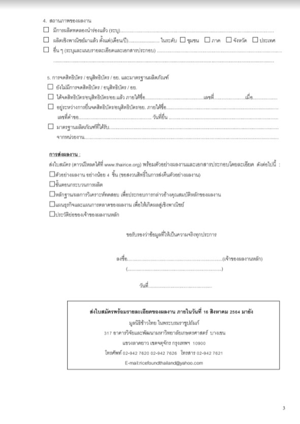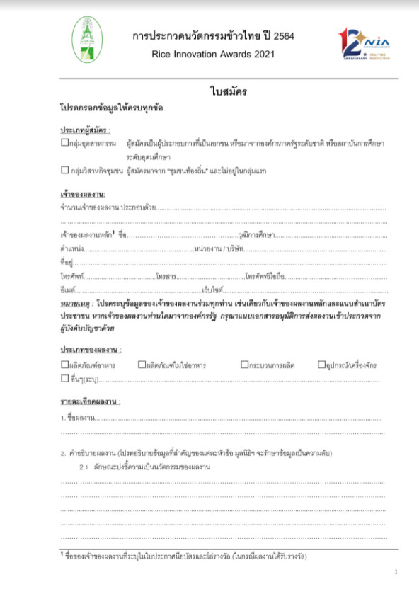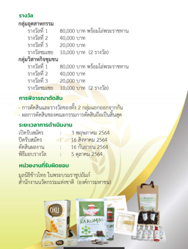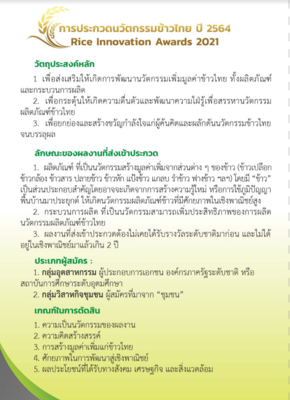สำนักงานเกษตรจังหวัดสกลนคร เชิญชวนกลุ่มวิสาหกิจชุมชน และกลุ่มอุตสาหกรรม ด้านการผลิตและแปรรูปข้าว ส่งผลงานประกวดนวัตกรรมข้าวไทย ปี 2564 ชิงเงินรางวัลพร้อมโล่พระราชทาน สมัครตั้งแต่วันนี้ ถึง 16 กันยายน 2564 ดูข้อมูลเพิ่มเติมได้ที่ https://drive.google.com/…/138z5uXMQdTp3POP…/view หรือ ทางเว็บไซต์ https://thairice.org/#section_1